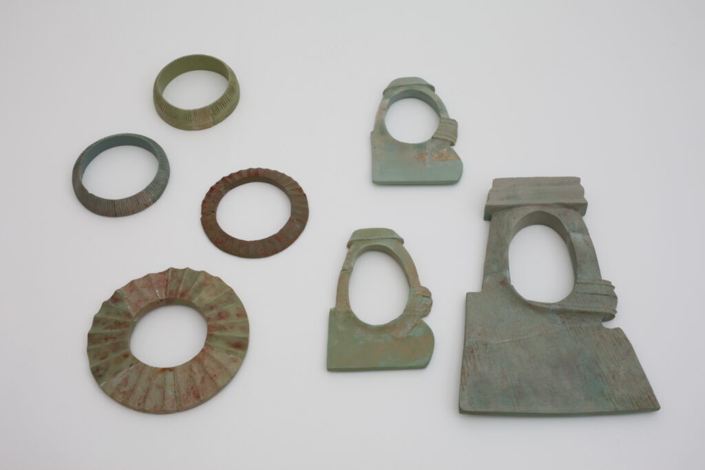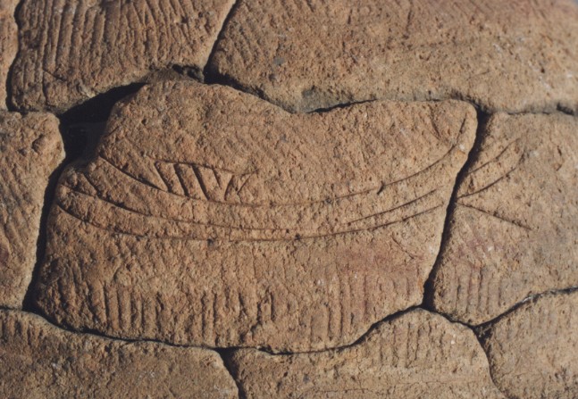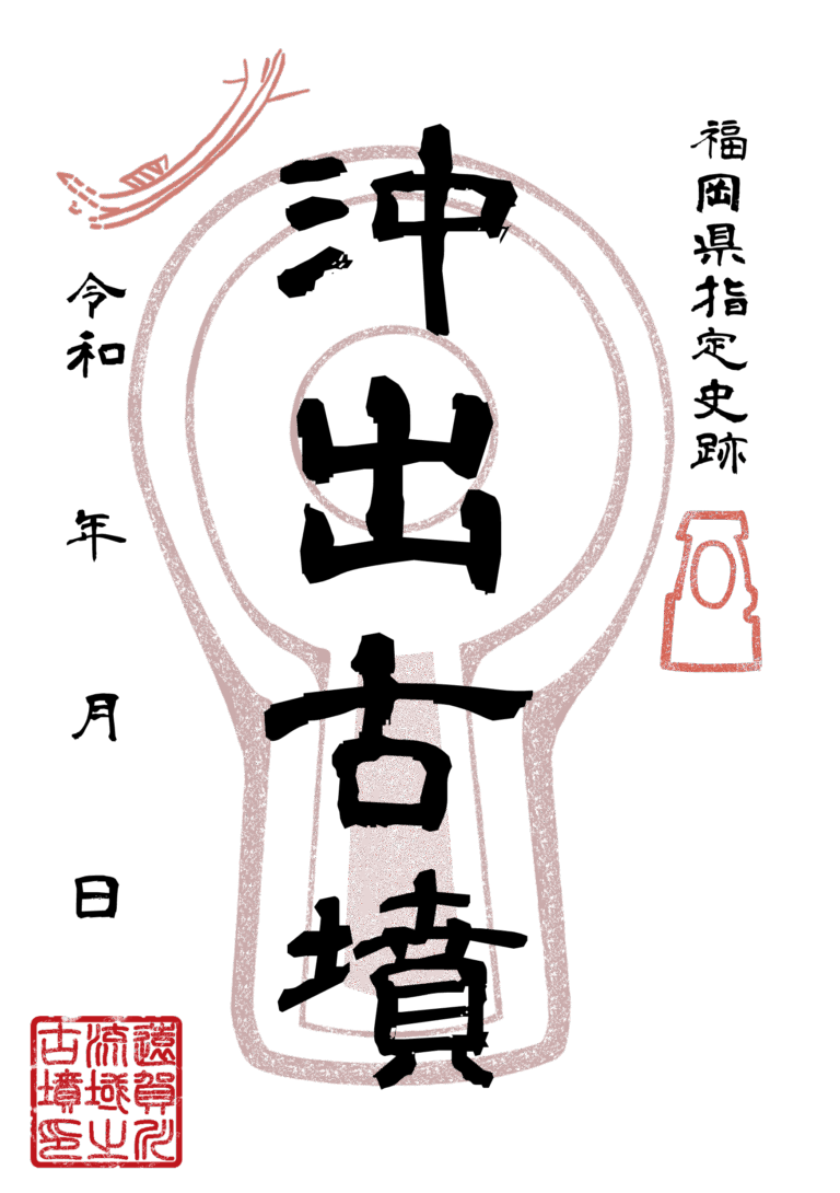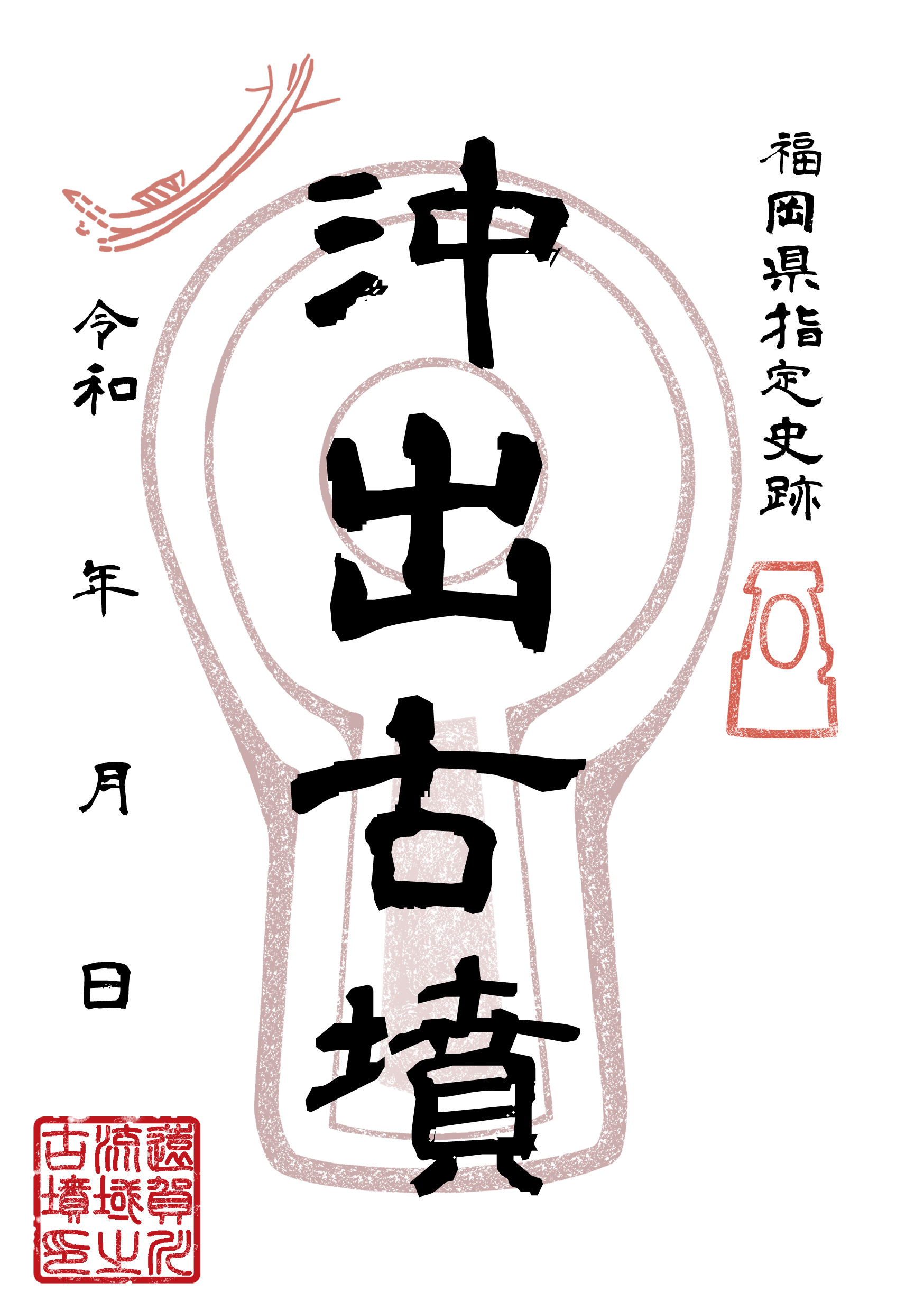 墳丘は前方部が2段、後円部3段で、斜面には石が葺かれ、壺形・円筒・朝顔形・家形の埴輪が立てられていました。後円部には、竪穴式石室が築かれ、舟形石棺が納められていました。また、九州の古墳では唯一、三種類の腕輪形石製品(鍬形石・車輪石・石釧)がセットで出土し、被葬者はヤマト王権と強い結び付きのある人物だと考えられています。また、九州で二例目となる「船」の絵が線刻された埴輪が発見されました。沖出古墳の出土品は碓井郷土館で常設展示しています。